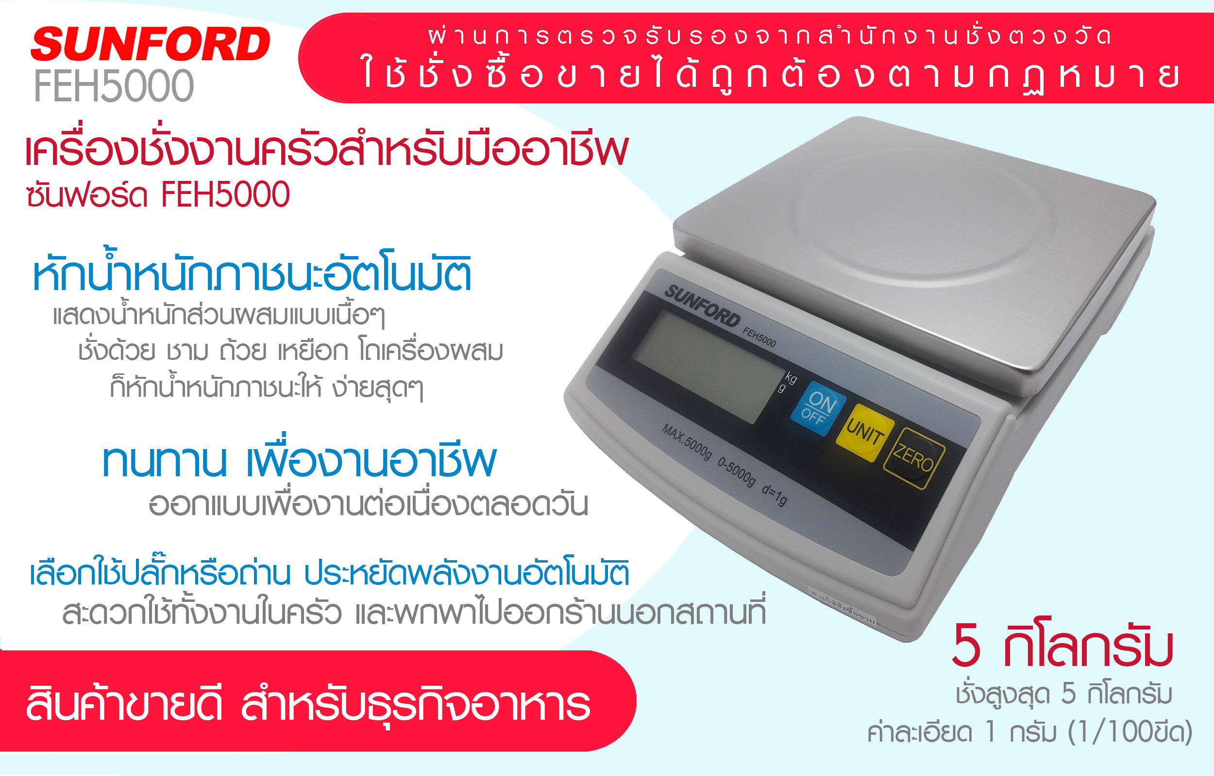เครื่องชั่งน้ำหนัก ระบบดิจิตอล SUNFORD FEH5000 5 กิโลกรัม เป็นเครื่องชั่งระดับชั้น III เพื่อการพาณิชย์